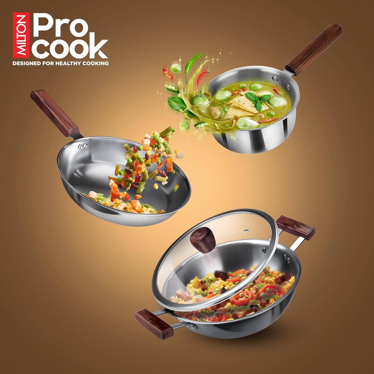 The Milton Procook Triply Stainless Steel 4-Piece Cookware Set is a perfect addition to any kitchen, offering premium quality and versatility for all your cooking needs. This set includes a 16 cm saucepan, a 22 cm fry pan, and a 24 cm Indian wok/kadai with a glass lid, all designed to provide even and fast heating for efficient cooking. The cookware is made from triply stainless steel, which combines a durable stainless steel exterior, an aluminum core for excellent heat distribution, and a stainless steel interior that is non-reactive and safe for cooking a wide range of dishes. The saucepan is ideal for making tea, boiling milk, or preparing sauces, while the fry pan is perfect for frying vegetables, meats, and making omelets. The Indian wok/kadai with a glass lid allows for cooking gravies, curries, and deep-frying, offering ample space for large quantities of food. The set also features a wooden handle on the wok and fry pan, providing a comfortable, heat-resistant grip for safe handling. Designed for both induction and gas stoves, this cookware set is versatile and can be used on any heat source. The sleek silver finish adds a touch of elegance to your kitchen, while the 3-year warranty ensures lasting quality and peace of mind. Whether you’re cooking everyday meals or experimenting with new recipes, the Milton Procook cookware set delivers exceptional performance, durability, and style.