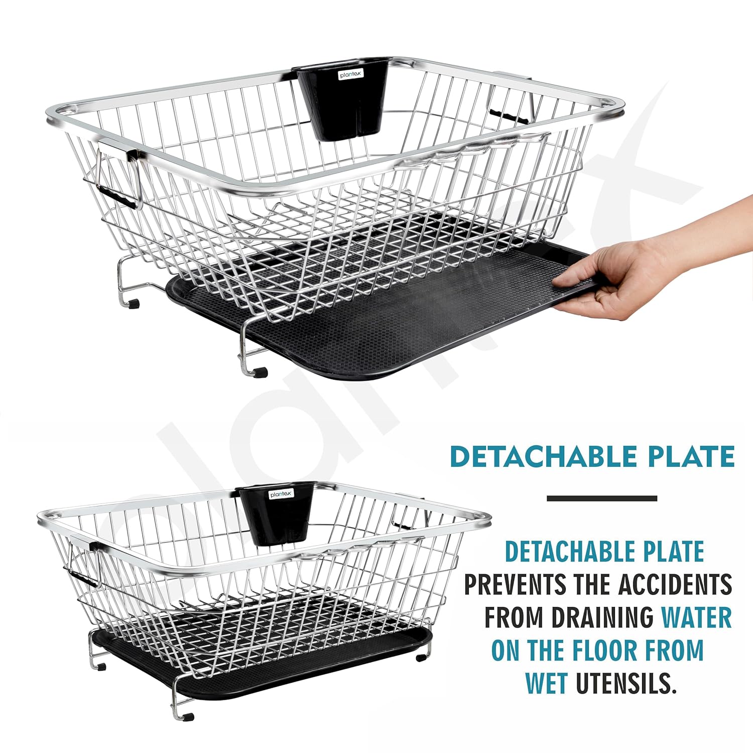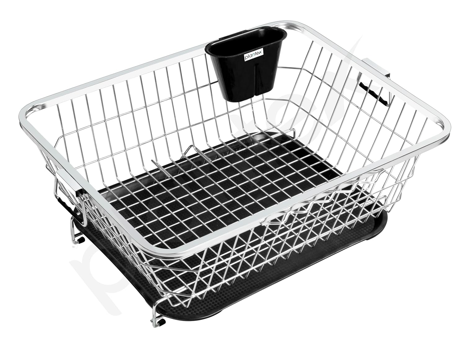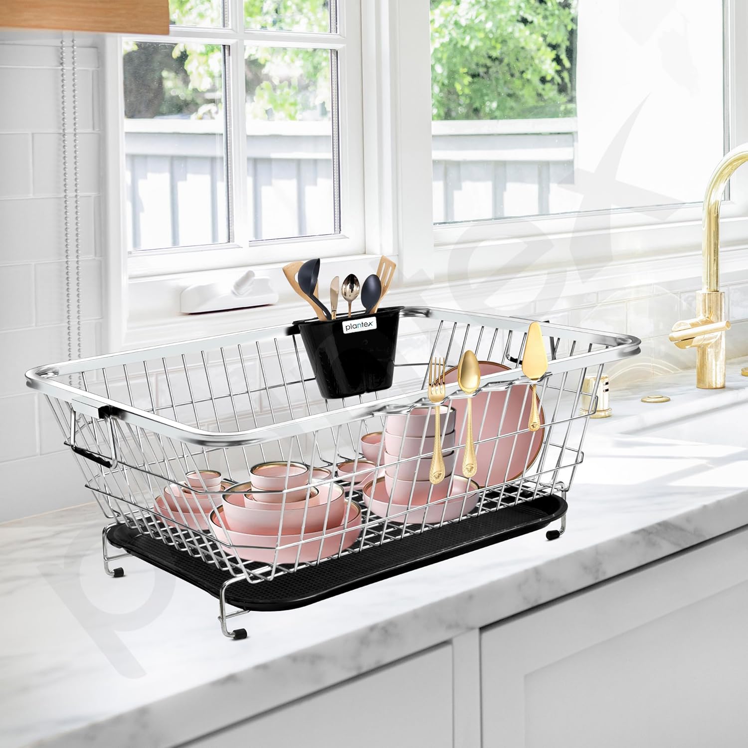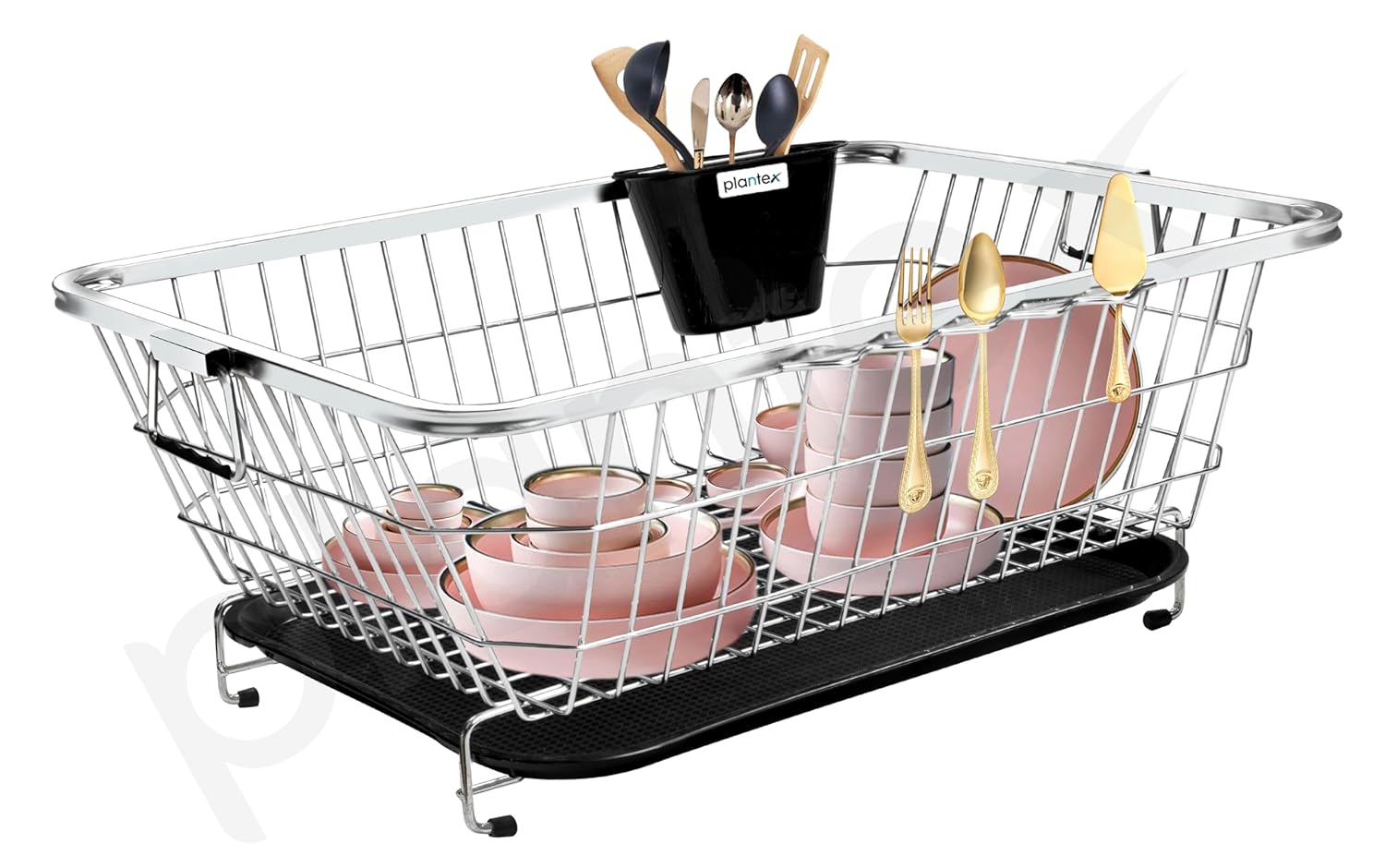 𝗗𝘂𝗿𝗮𝗯𝗹𝗲 𝗠𝗮𝘁𝗲𝗿𝗶𝗮𝗹: Plantex dish/utensil drying rack is made of high-grade stainless steel with a layer of nickel-chromium which gives it a mirror finish. The mirror finish by nickel-chrome coating on this dish drying rack keeps it rustproof and corrosion-free.It has rubber fittings in its legs that make our utensil rack completely scratch-free.