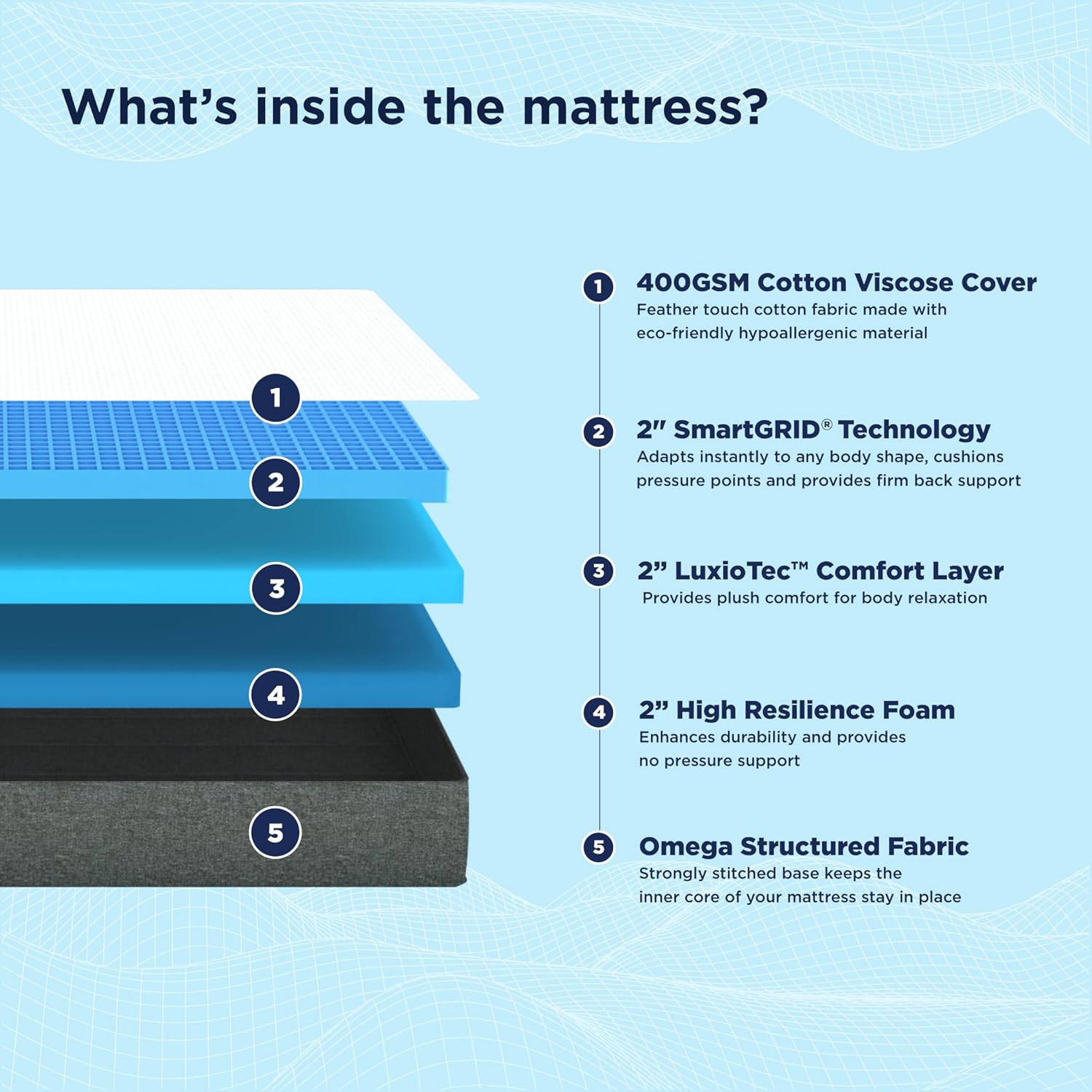 Patented Japanese SmartGRID Technology: Developed by DRDO scientists, the SmartGRID mattress intelligently adapts to your body shape. SmartGRID’s 2500+ air channels allow adequate airflow for a deeper and peaceful sleep.