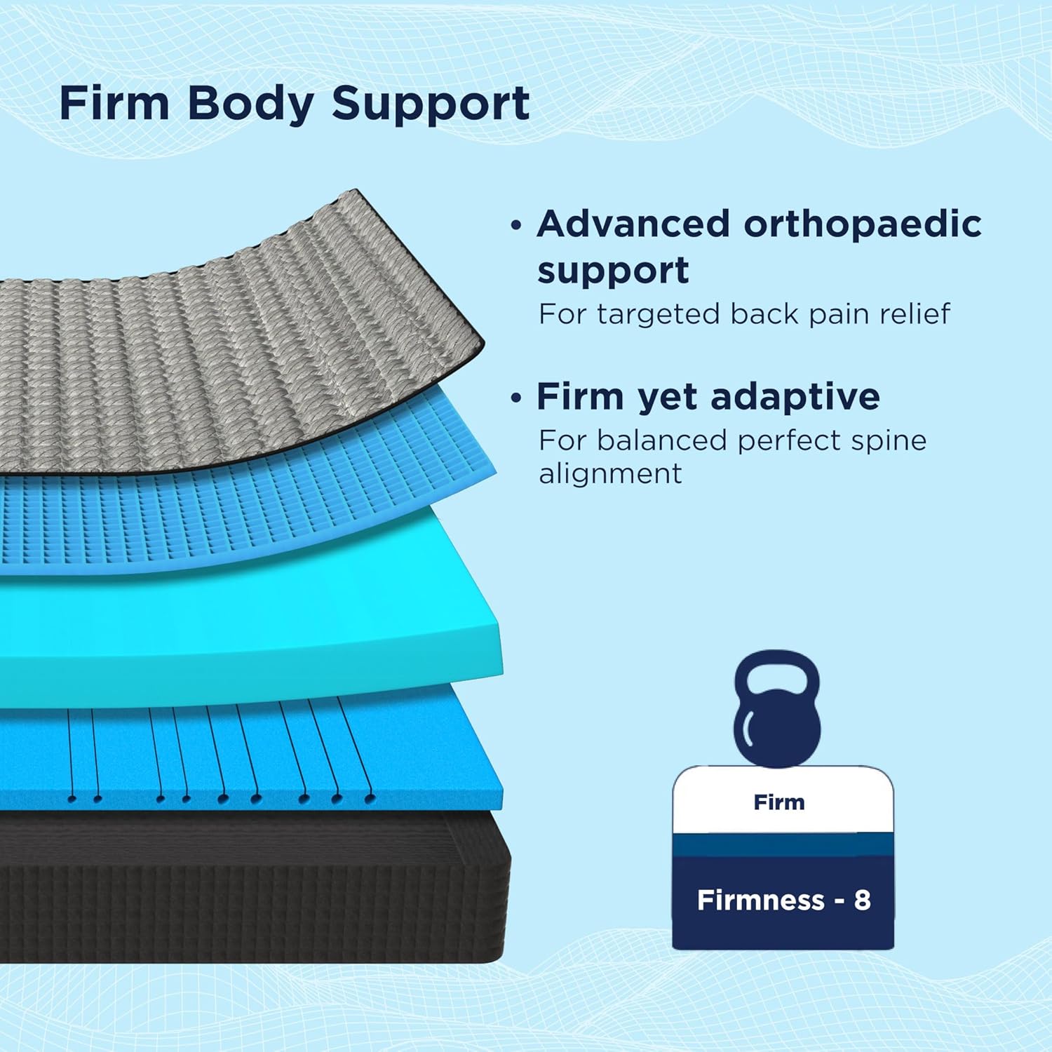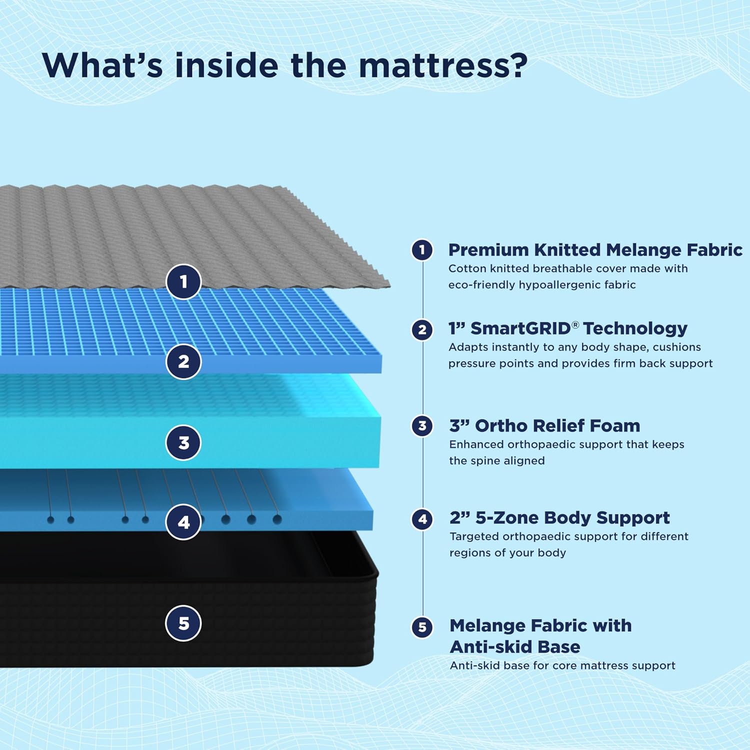 5-Zone Orthopedic Support: The Ortho Relief foam enhances the comfort of your spine & provides a firmer feel with a firmness score of 8. An additional Orthopedic Support layer offers targeted support in 5 zones providing optimal natural posture alignment.